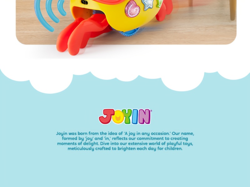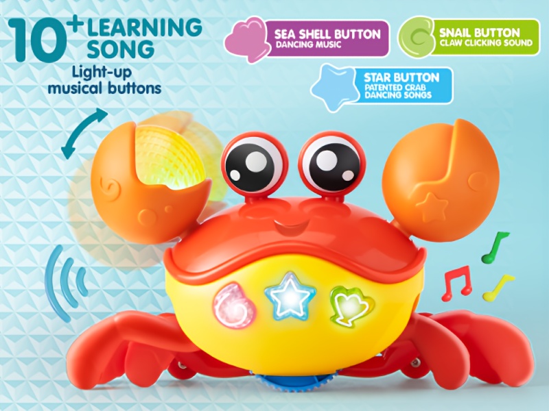 Illuminated Musical Buttons: I am a grooving crab with lights that move to my catchy melodies. Original Crab-Inspired Melodies: Over 10 songs to make little feet move and claws click. Volume Adjustment: Easily manage my sound level. Ideal for maintaining harmony at home.