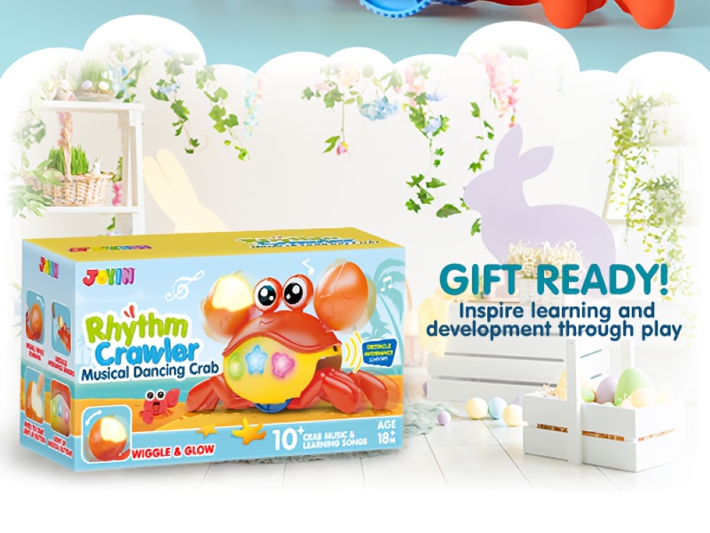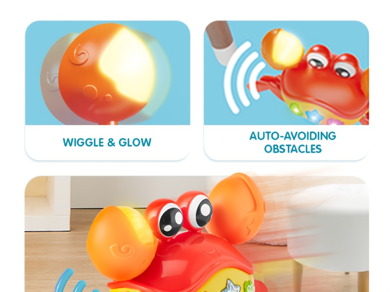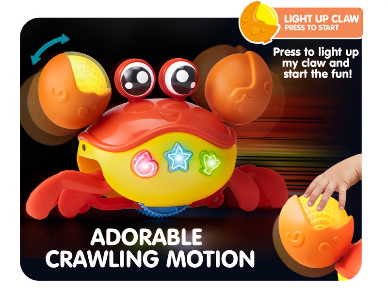 Step 1: Place 3 AAA batteries (not provided). Step 2: Activate the main switch located at the bottom of the crab. Step 3: Squeeze the crab's claw to get it moving! A Charming and Fun Crab: I'm Rhythm Crawler, a vibrant crab toy for babies that lights up to bring joy to your child! Cute Crawling Action: I move like a crab on the go, avoiding obstacles with clever sensors. Let's enjoy a crab walk!