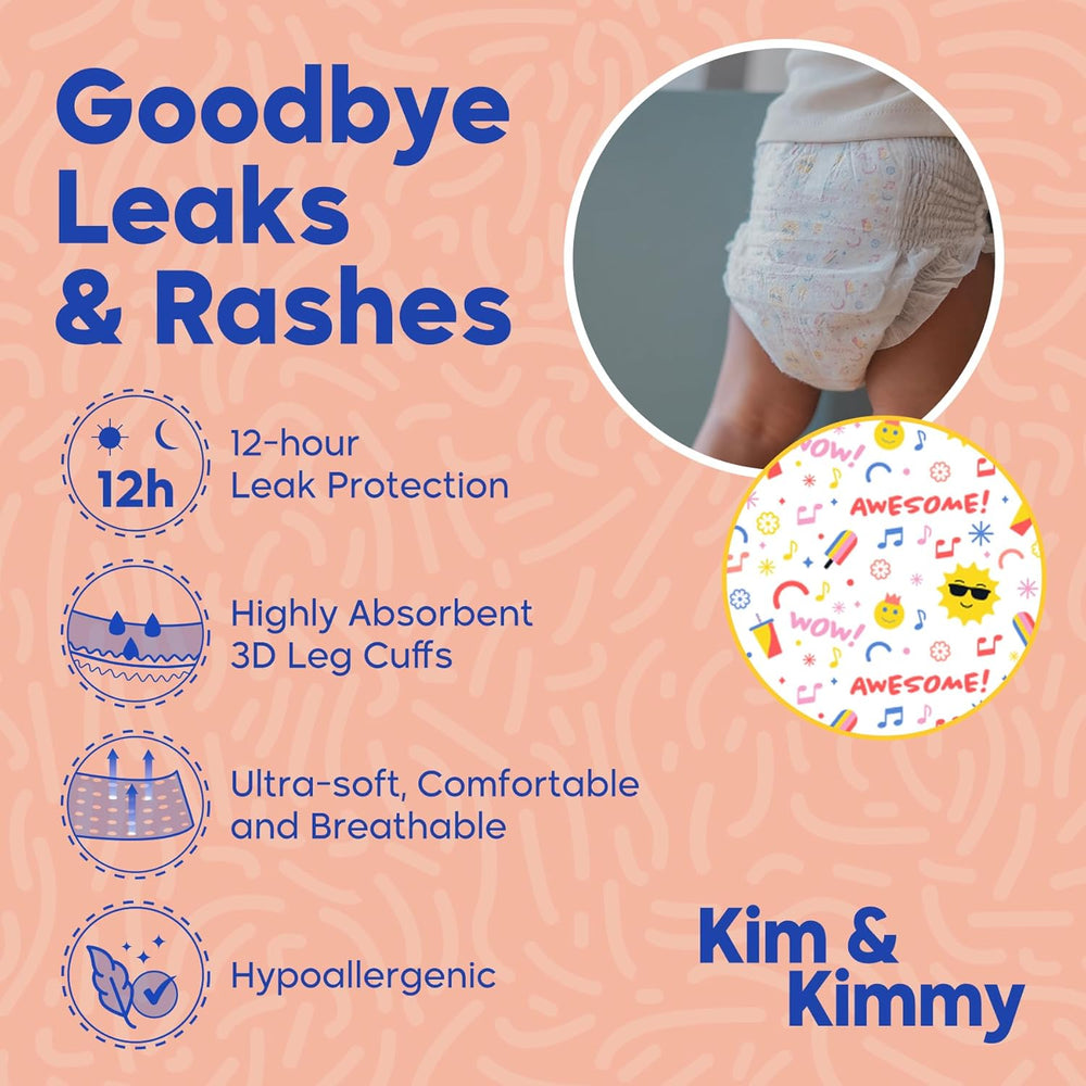 Kim & Kimmy Size 5 Baby Pants deliver all-day dryness and comfort for active little ones weighing 12–17kg. These eco-friendly pull-up pants provide up to 12 hours of leak-free protection with ultra-soft, hypoallergenic materials—ideal for sensitive skin and eco-conscious parents.